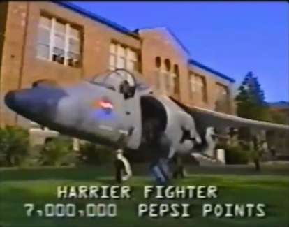 But to end the television commercial on a funny note, they showed a kid arriving at school in a Harrier jet, wearing of course the Pepsi t-shirt and leather jacket and sunglasses, with a caption at the bottom showing something in the line of HARRIER JET, 7,000,000 POINTS.