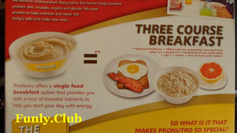 With this they are saying one bowl of ProNutro is a three course breakfast in one. 50g bowl ProNutro + 200ml milk has comparable macronutrient values as half a grapefruit + small bowl of oats with milk + egg & 1 rasher & slice of toast with butter.