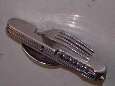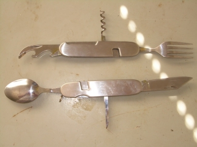If we fold open each and every utensil in this unit, we find it has a knife, a fork, a spoon, a bottle opener, a can opener and a corkscrew, all folding neatly away into what can only be described as a pocket knife, very easy to use one at a time or in the case of a knife and fork, two at a time.