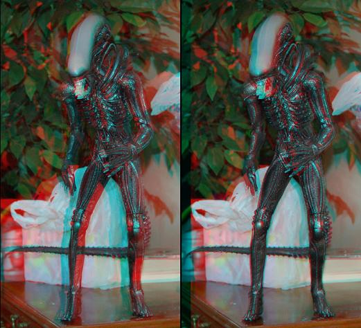 These 2 images show the same composite but with different POCs. If you look at them with 3D glasses on (red, cyan) you will notice that in the first one, the alien is completely behind the screen. In the second one its left arm and face are sticking out of the screen.
