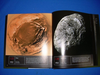 The page on the right in the above photo for example shows a photo of a heavenly body, with this underneath it: "Heperion. Length: 370 km. Icy Natural Satellite. 1.48 million km from Saturn. Beyond Titan lies the bizarre and beautiful moon Hyperion. Its irregular shape and unpredictable rotation indicate that is is the vestige of a larger moon that once suffered a catastrophic collision. however, Hyperion's strangely sponge-like surface, which in places resembles an impact frozen in 'mid-splash', still largely defies explanation."