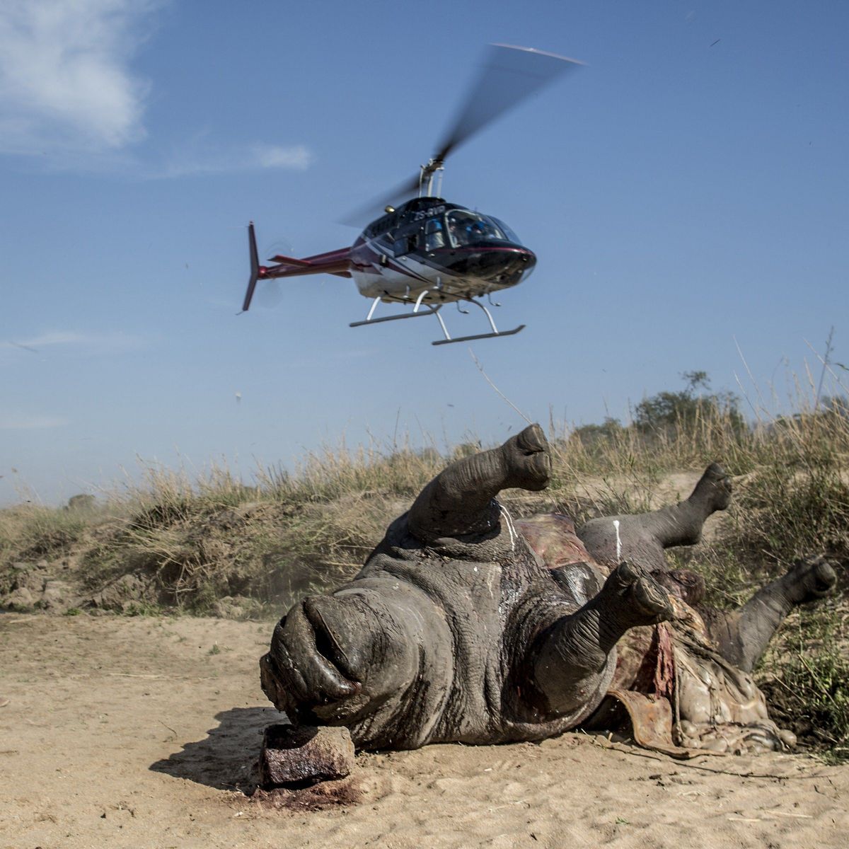 Yup, it indeed seems so. Black men from across the border lean out of the helicopter and shoot dead the beautiful rhinoceros with a bazooka, taking special care to destroy its body from the middle down to the tail. The head with the valuable horn is obviously not damaged.