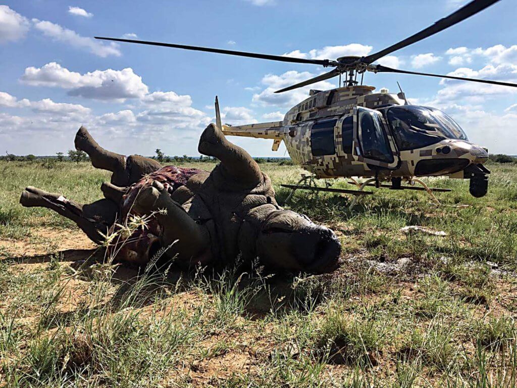 The black men jump out of the helicopter with sawing equipment of various sorts. It takes only minutes for them to remove the rhino’s horn from its nose.