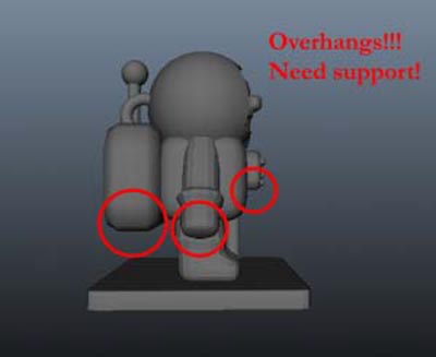 The parts of your print which would be floating on air are called “overhang“. Check out the next Illustration to see the identified “overhangs” – the red circles.
